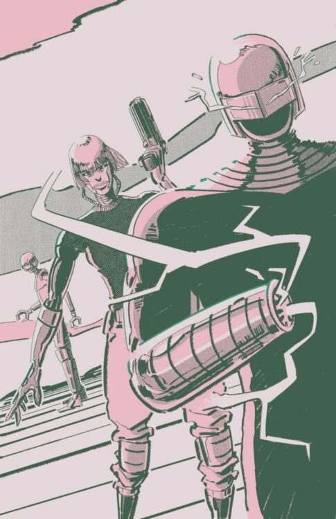 Sure, there might not have been enough time to fully sit with these characters yet. That’s the price of serialized storytelling—26 pages to get in and out. But Van Der Knapp has taken many fun sci-fi high concepts and tied each to a stylish character design. So the issue finds a lot of joy in introducing them one by one. Like Axel, whose “distorted, elongated frame wields supercharged arms, the electricity cutting through the dry air.” Or the aforementioned husband of the bounty hunter, introduced on the first page as “A shell that holds remnants of a man.”