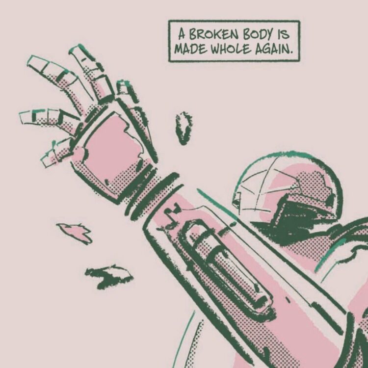 Fortress #3 only checks in briefly with Itar and Caleb, instead focusing on the side characters of a rapidly growing cast. All of them straddle the line between robot and human. Like the bounty hunter, Kyra, searches for her husband’s memory files to try and restore some humanity to his robotic shell. Or an outdated battle droid named “Old Roy” who uses an old war-machine ritual to acknowledge the cost of his victories.