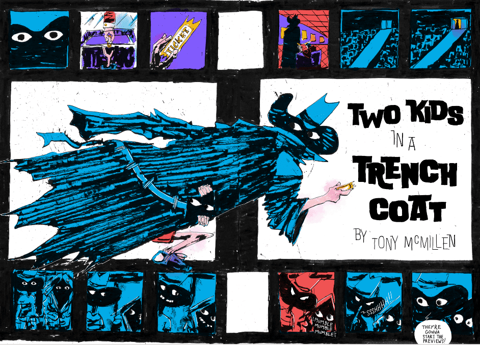 Tony McMillen: Thanks, it’s all about my adolescence, obsessed with R-rated movies, explicit music and extreme comics growing up in the 90s. Two Kids in a Trench Coat is my first major non-fiction work, a sorta graphic memoir (if I’m putting on airs), but it’s not a typical auto-bio comic either: I use the titular Two Kids in a Trench Coat characters as guides to walk us through all the pop culture and real life stuff I wanna explore with the book. Also — unlike my usual production method — I’m releasing the first 16 pages as a separate sort of extended preview before I finish the full book sometime next year. That’s a first for me, too.