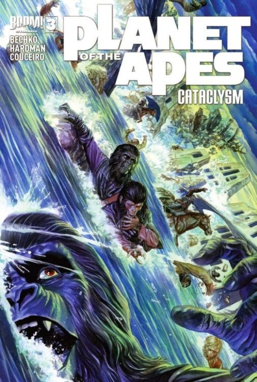 In the Boom! Studios prequel tale Planet of the Apes Cataclysm, a biblical epic unfolds over the eight years before Taylor arrives from the past. Corinna Bechko and Gabriel Hardman start their story off with the destruction of the moon and the events that follow read like the 10 plagues of Egypt. Meteor showers, floods, and starvation face the Apes as they try to adapt to their new climate.